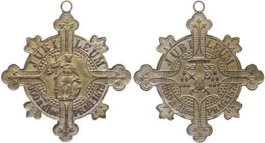 Svátostka ve tvaru kříže na 900 let biskupství, 1873#Postř Svatý Václav, opis / klobouk, mitra, kříž, berla, opis Postř.mosaz 39x39mm, Př.654, Gr.97_orig.raž.ouško