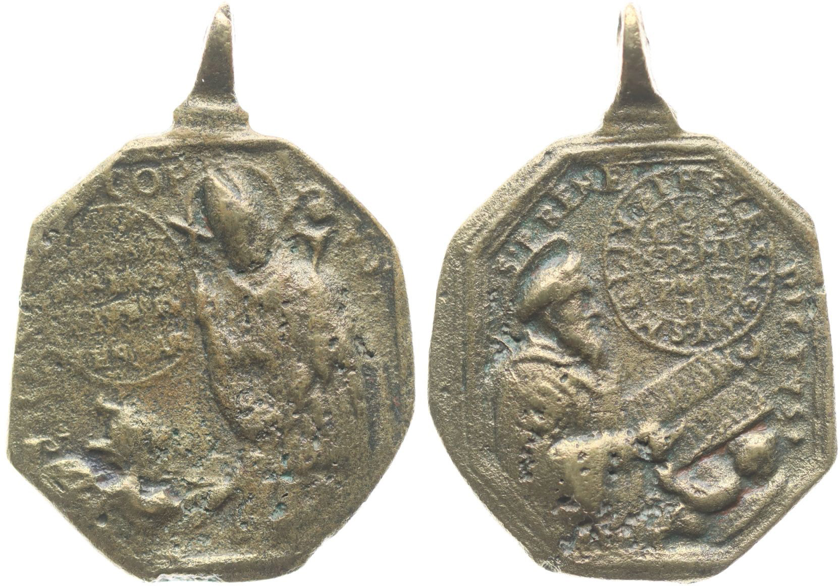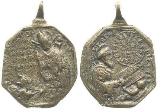 Sv.Prokop s pedem a křížem drží čerta, opis / Sv.Benedikt nad otevřenou knihou, opis, Bronz.osmihran 25x27 mm, Přib.202_orig.ouško