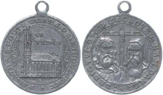 Karnet-Kyselý, Památka z pouti cyrilometodějské, b.l. Poprsí světců, velký kříž a opis / kostel, gotická kružba, opis, Sign., Al 29 mm, Bur.126_orig.raž.ouško