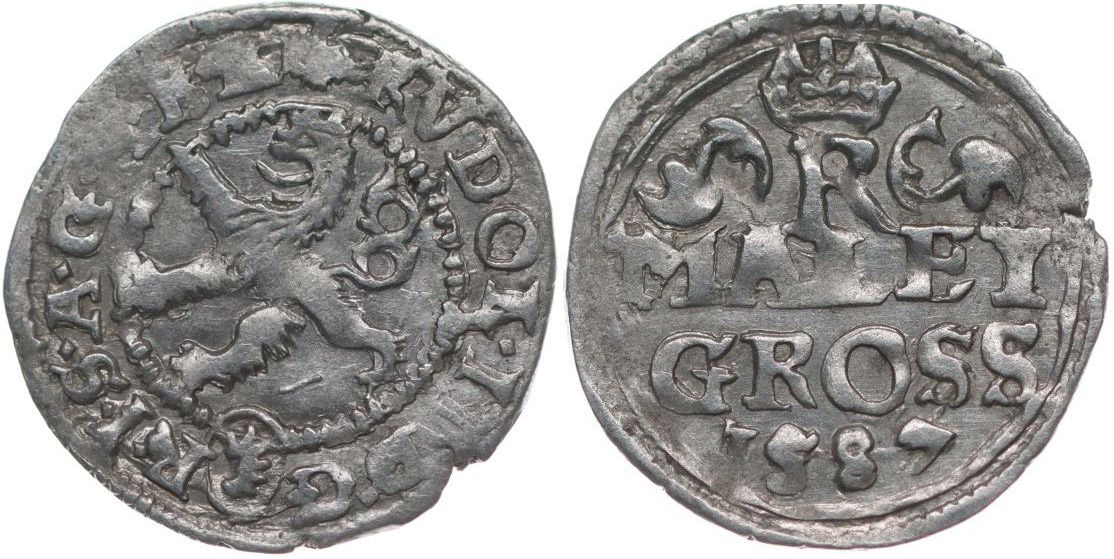 Malý groš 1587, K.Hora-Šatný, HN.1b (opis 7a), Ja.6b var.: mincmistr.značka posazena výše do středu mince_dr.ned.