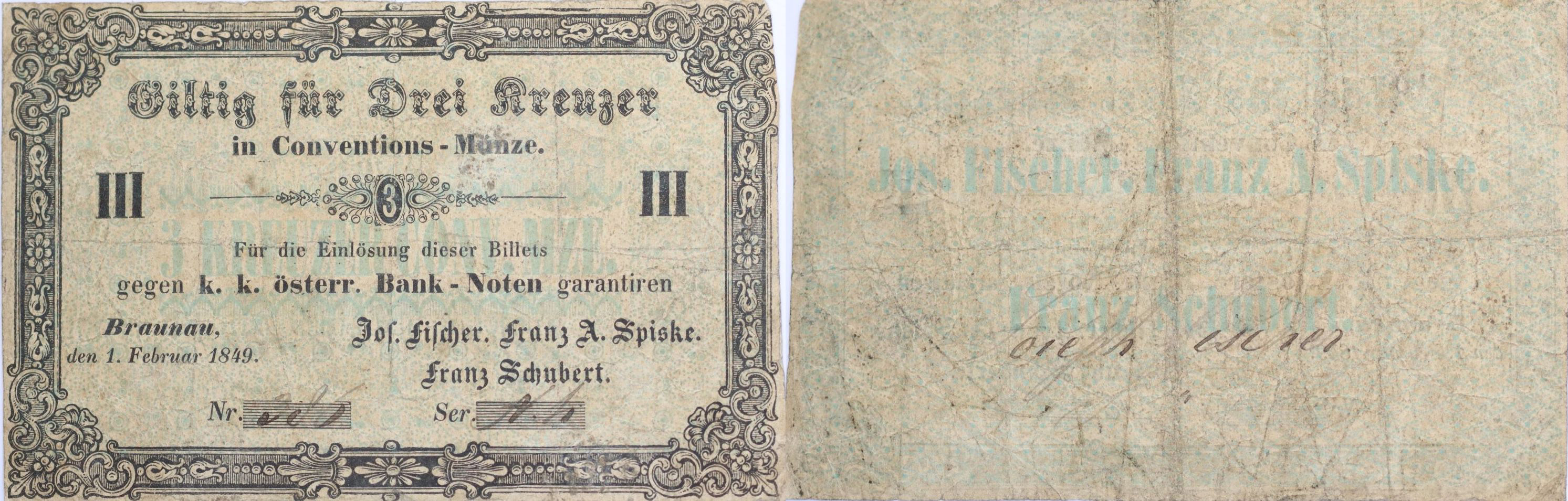 Broumov (Braunau), 3 Krejcar 1.2.1849, J.Fischer, F.A.Spiske, F.Schubert, čís.386, sér.Nh, bez podpisu a razítka, V-R.140.02.01
