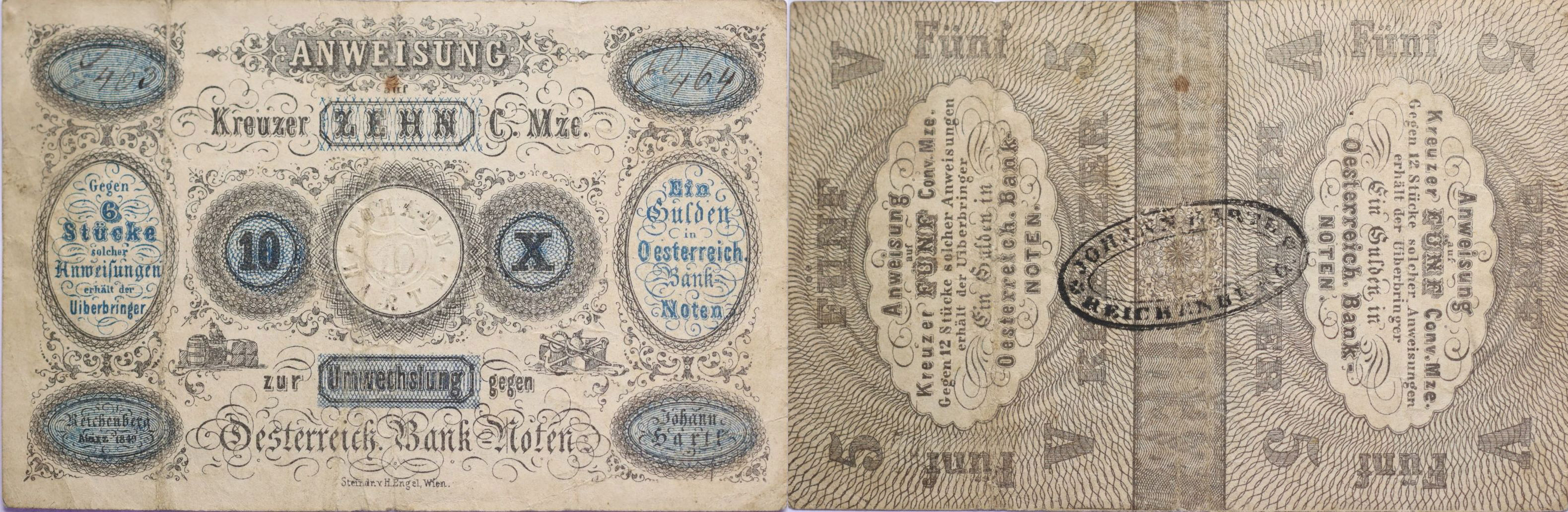 Liberec (Reichenberg) - 10 Kr.C.M. III.1849, Johann Hartl černé raz.ítko č.D463 a E464, VR.1080.11.10.III