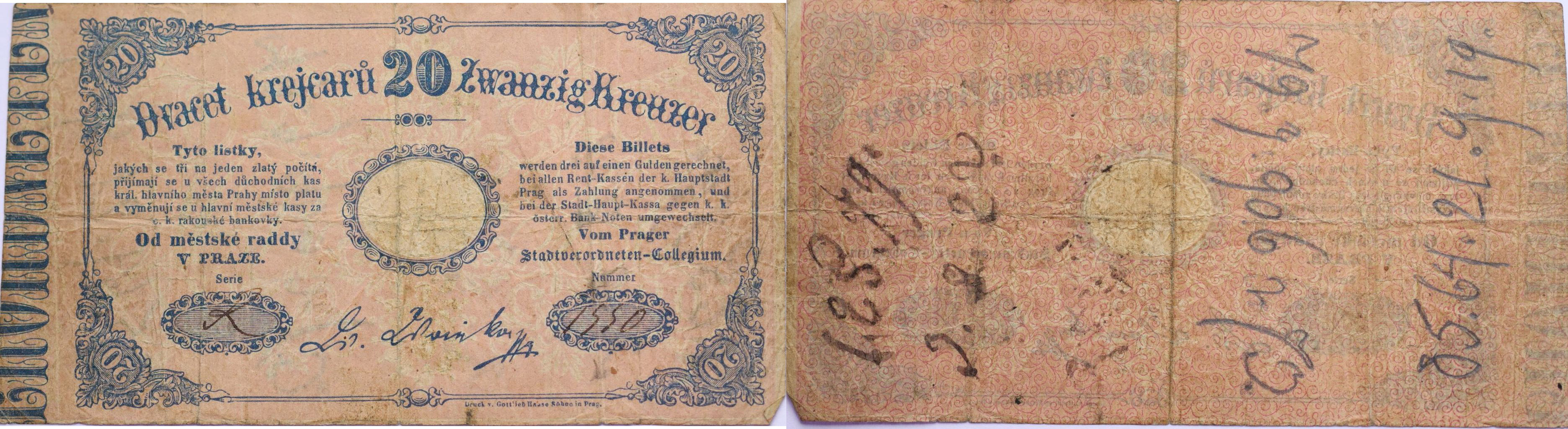 Praha (Prag) - 20 Kr.C.M. b.l. (1848), Městská rada sér.R, číslo: 1550, VR.1040.18.03