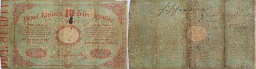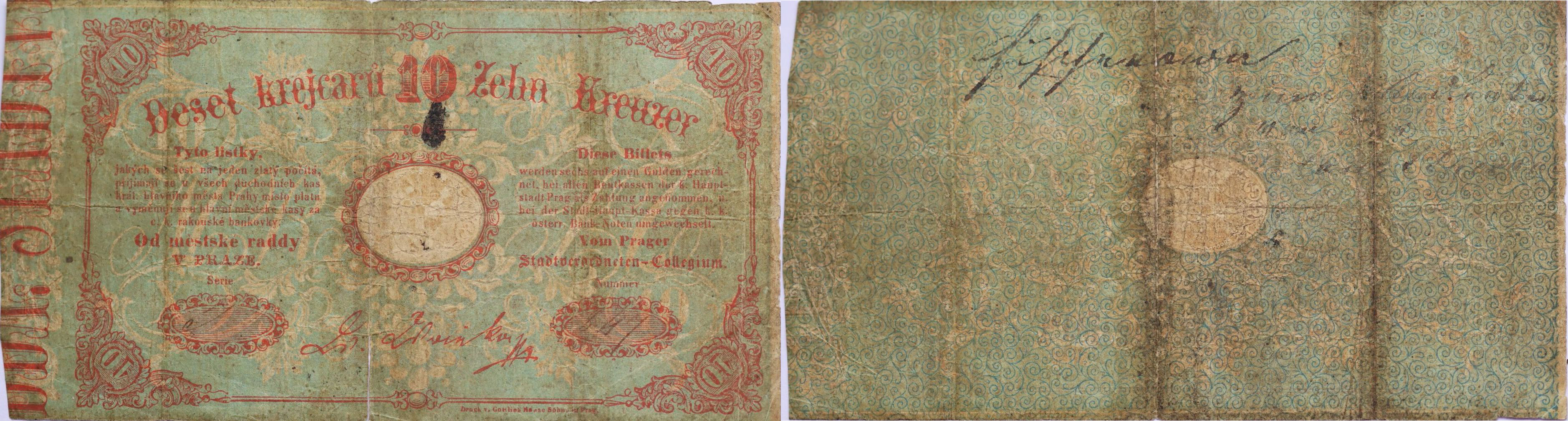 Praha (Prag) - 10 Kr.C.M., b.l. (1848), Městská rada sér.Z, číslo: 847, VR.1040.18.02_natrž. v přehybu 25 mm