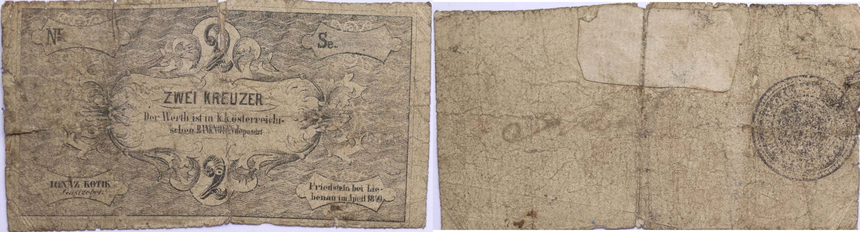 Frýdštejn (Friedstein bei Liebenau) - 2 Kr. C.M., IV/1849, Ignaz Kotik Gastgeber, bez série a čísla, razítko, V-R.335.02.02_část.podlepen