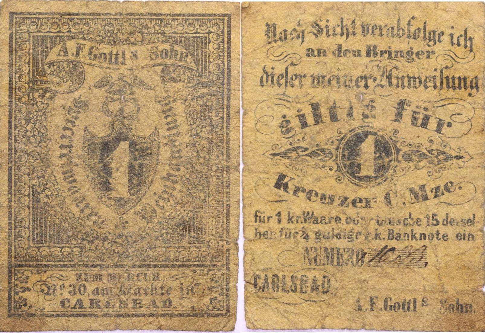 Karlovy Vary (Karlsbad) - 1 Kr. C.M., b.l., A.F.Gottl´s Sohn č.1033, V-R.185.16.01.a