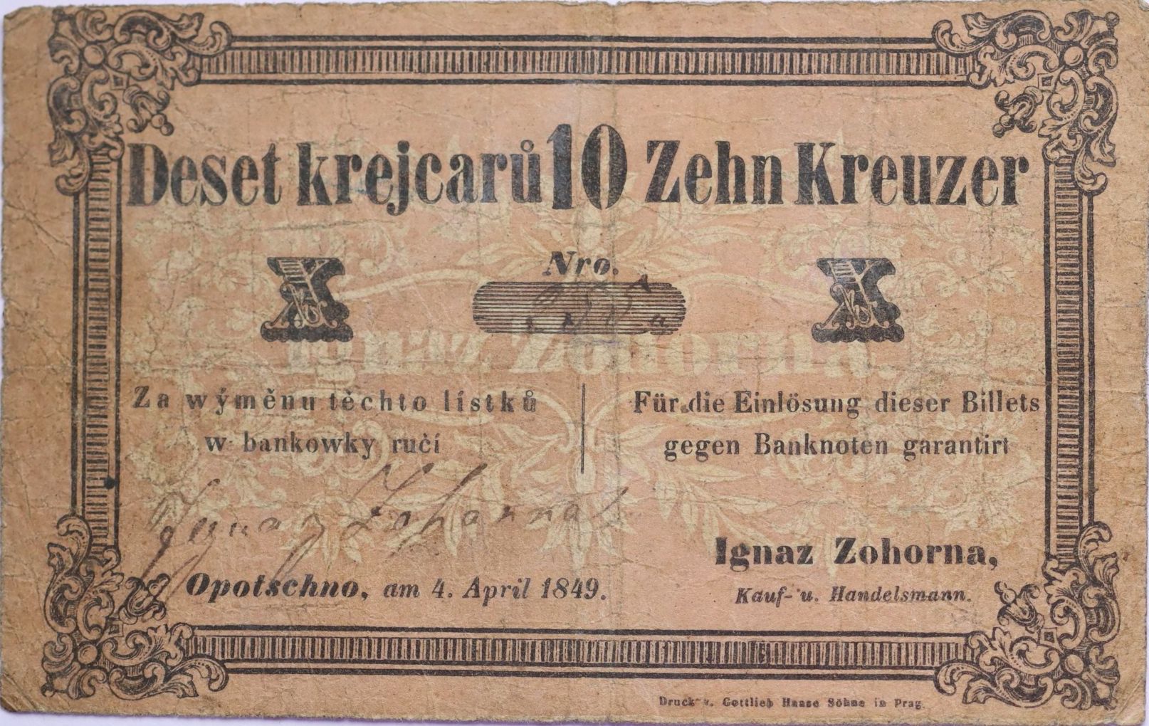 Opočno (Opotschno) - 10 Kr.C.M. 4.4.1849, Ignaz Zohorna čís.955, s podpisem, V-R.960.02.03