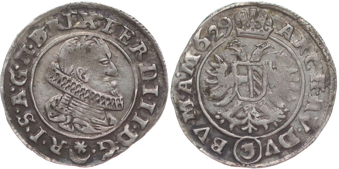 3 Krejcar 1629, Praha-Hübmer, jako J.28c, jako MKČ.760, ale nepopsaný opis v av.: D.G. - R.I.S._R!
