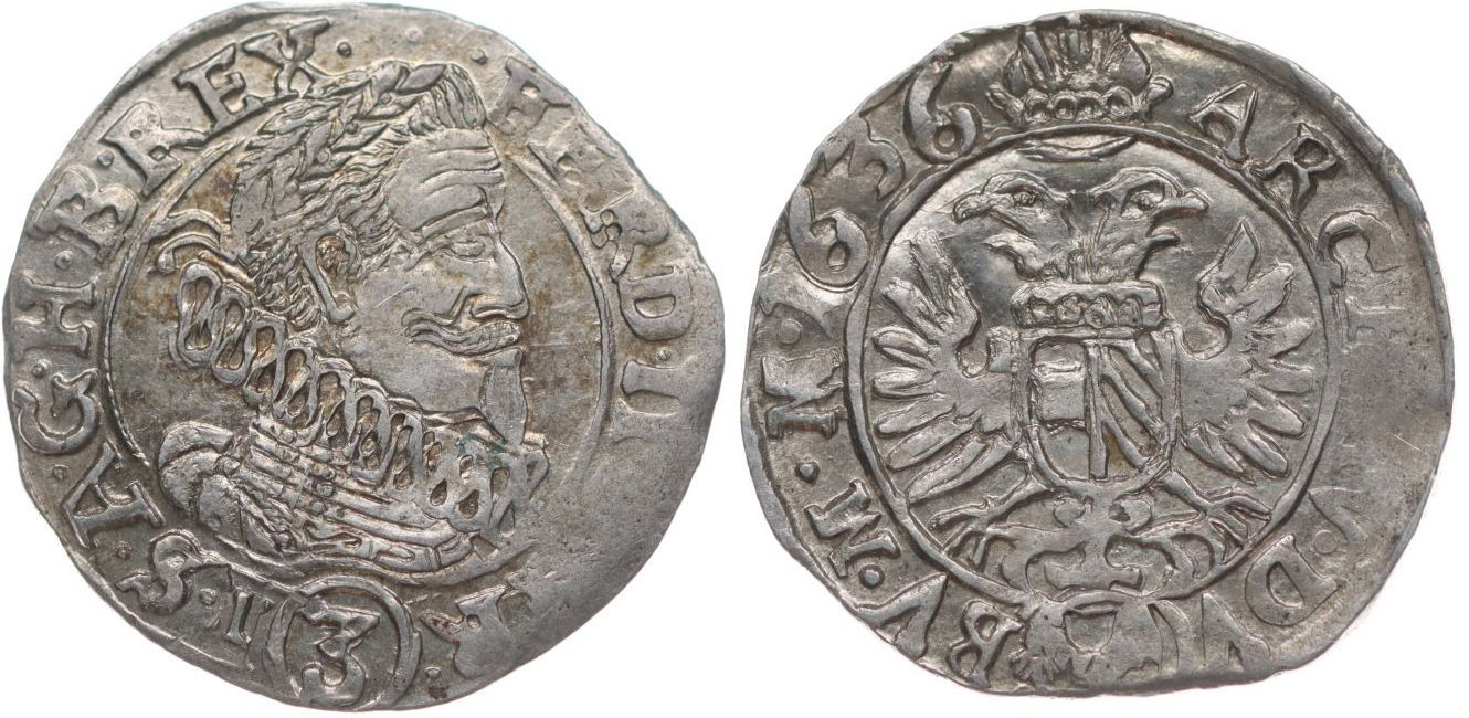 3 Krejcar 1636, K.Hora-Geronis, J.35a, MKČ.815, Her.1191 opis: FERD.II., větší hlava_R!