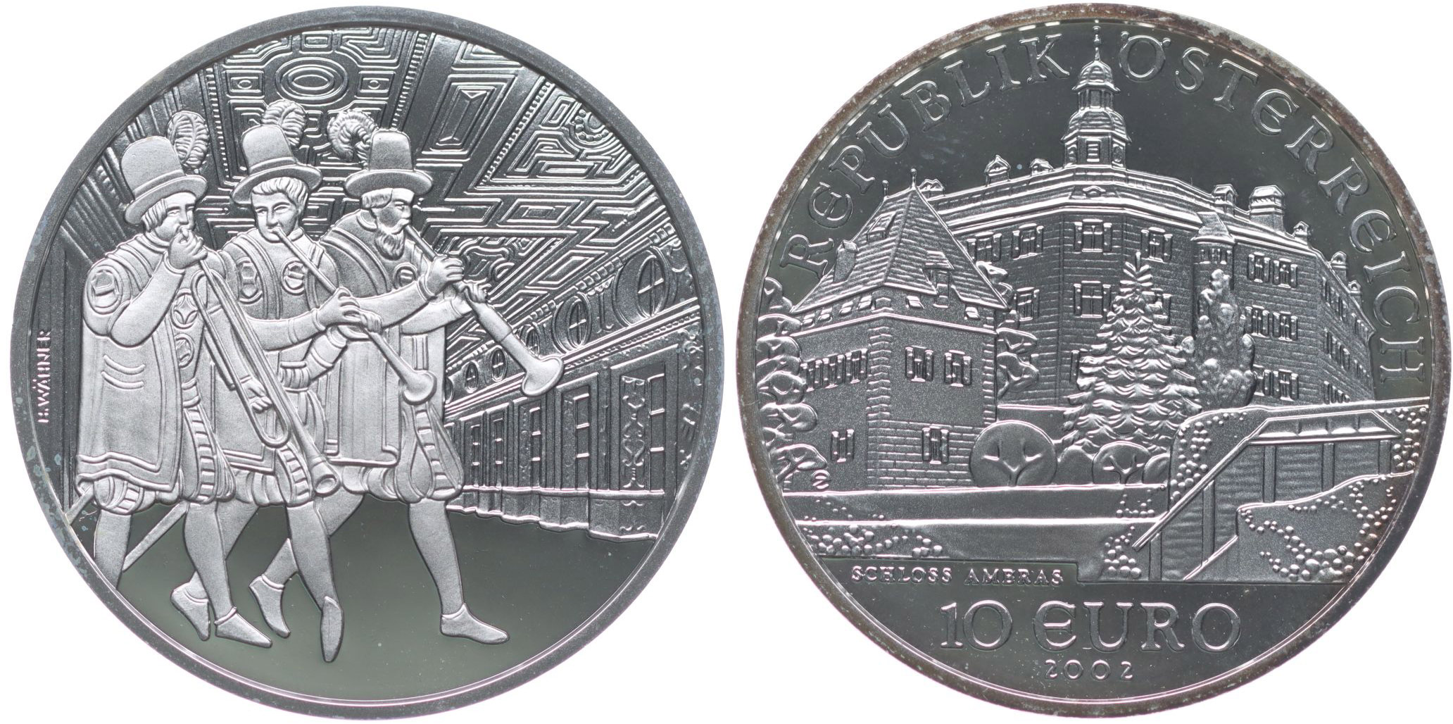 Rakousko - 10 Euro 2002 - zámek Ambras, Punc.925 Ag 32 mm, 17,30 g _orig.kapsle
