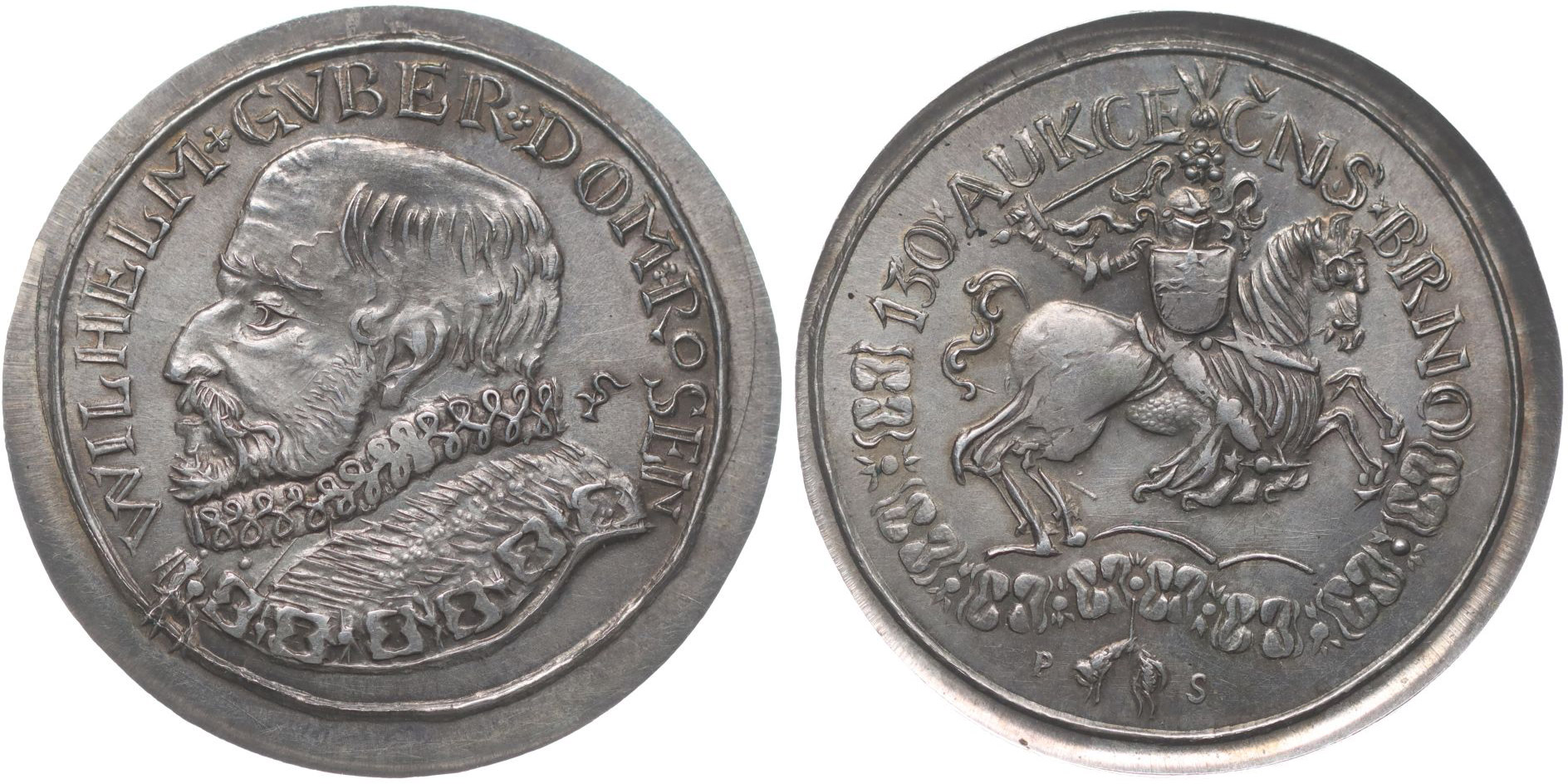 Žeton k 130. aukci Brněnské pobočky, 12.3.1995 Replika 4 dukátu Viléma z Rožmberka, opis / cválající rytíř v branění zprava, opis, Sign.P-S, Nepunc., Ag 30 mm, 8,03 g, náklad 68 ks MF.A2/26b, Sas.4b