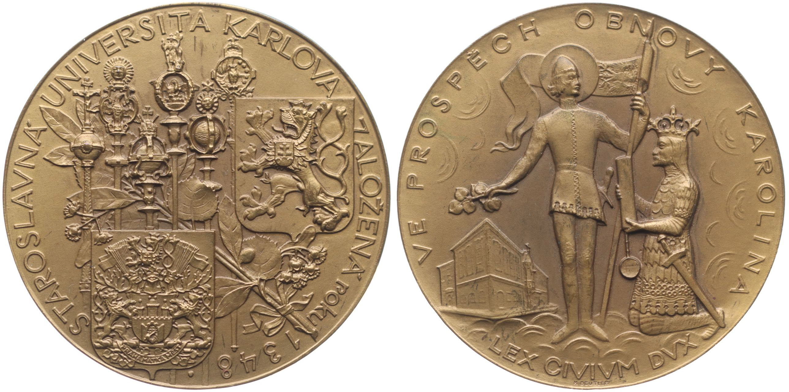 Staroslavná univers.Karlova - ve prospěch obnovy Karolina, b.l.(1933) Znaky Prahy a ČSR, v pozadí univ.insigie, opis / klečící Karel IV. před Sv.Václavem, opis, Sign., Bronz 55 mm_orig.etue
