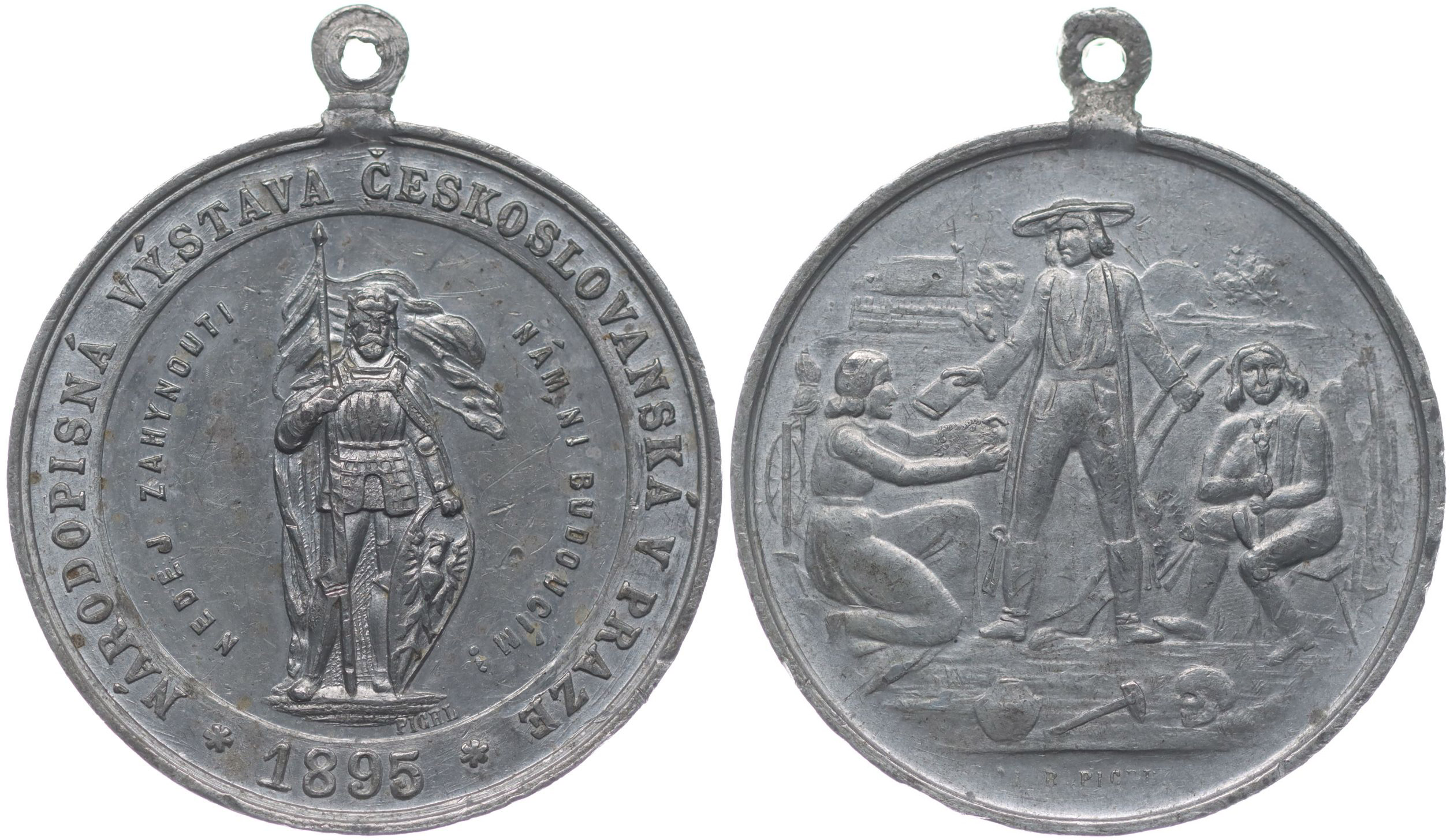 Pichl - socha Sv.Václava, 1895#Sn Sv.Václav čelně, opis / tři postavy na poli, v popředí archeolog. předměty, Sign., Sn 39 mm_orig.raž.ouško