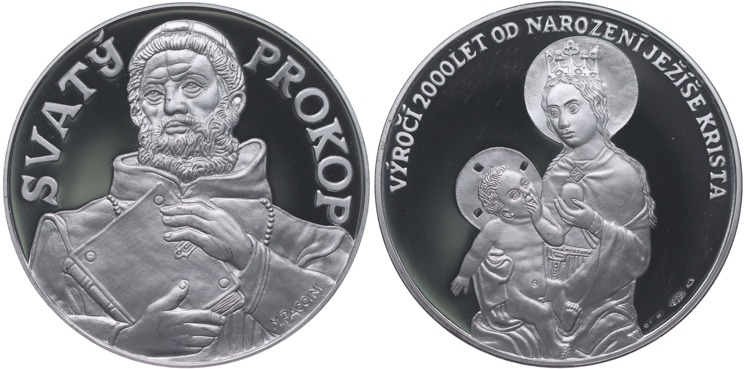 M.Paccini - medaile k výročí 2000 let od narození Ježíše Krista, b.l. Poprsí Svatého Prokopa čelně, opis / Madona s dítětem, opis Punc.925, Ag 40 mm, 20 g_orig.kasple