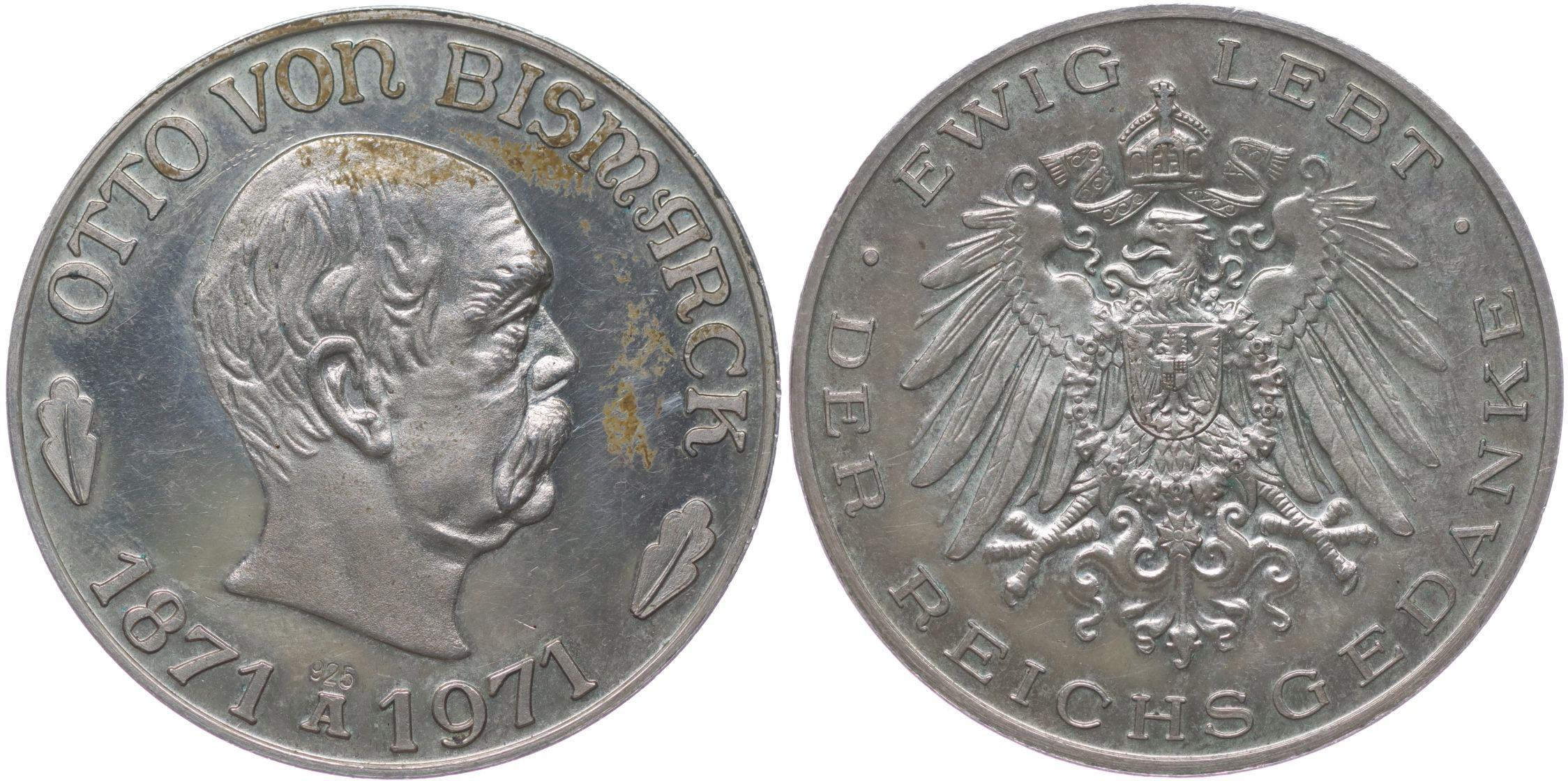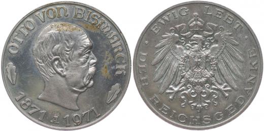Nesign. - 100.výročí vzniku Německého císařství 1871 - 1971 Poprsí Otto von Bismarcka zprava, opis / korunov.německý znak, opis Punc.925, Ag 35 mm, 19,90 g