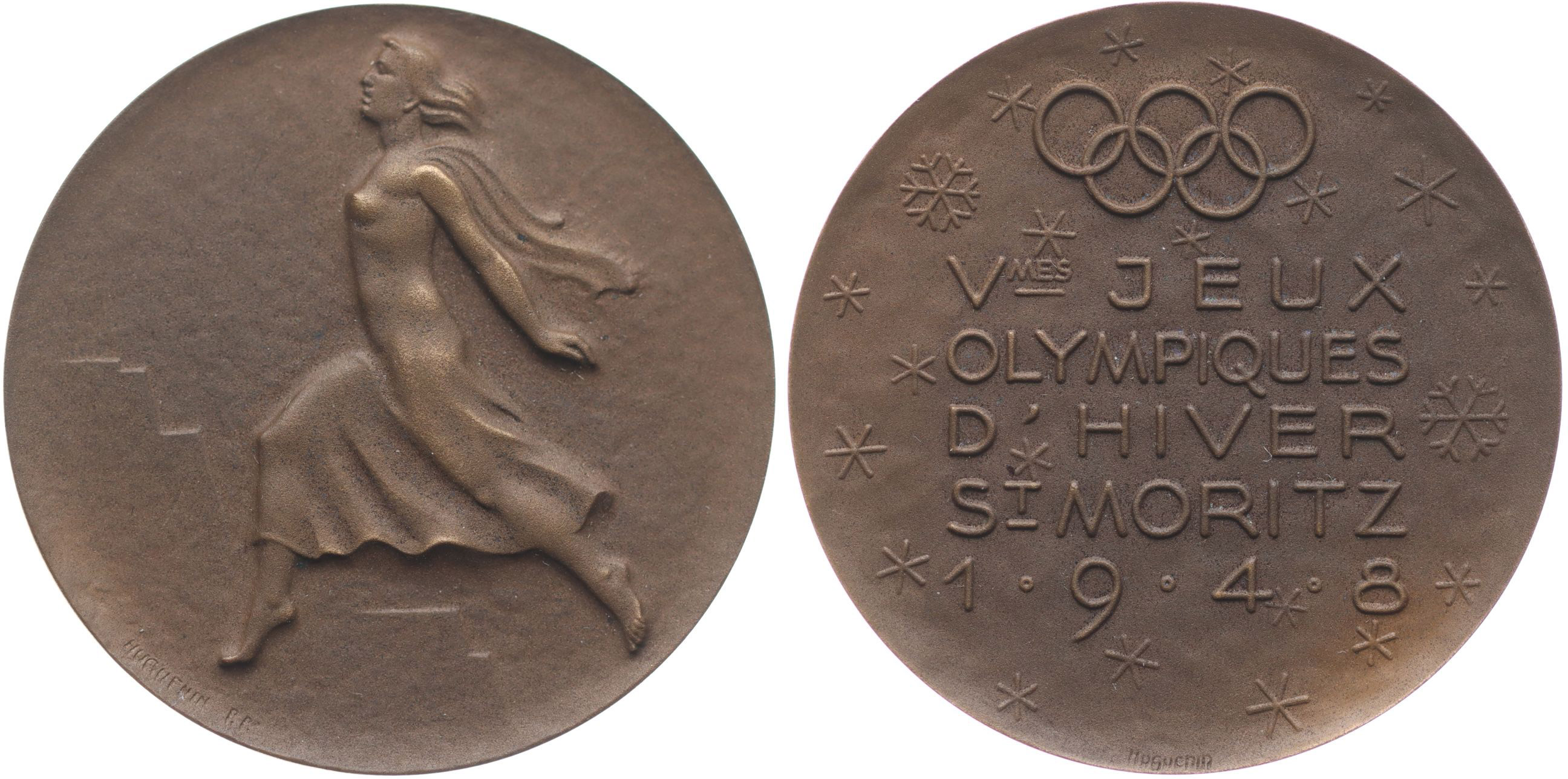 V. ZOH ve Svatém Mořici 1948, kráčející ženská postava zleva / Pod olympijskými kruhy 5řádk.nápis, Sign., Bronz 40 mm _orig.etue s olympijskými kruhy