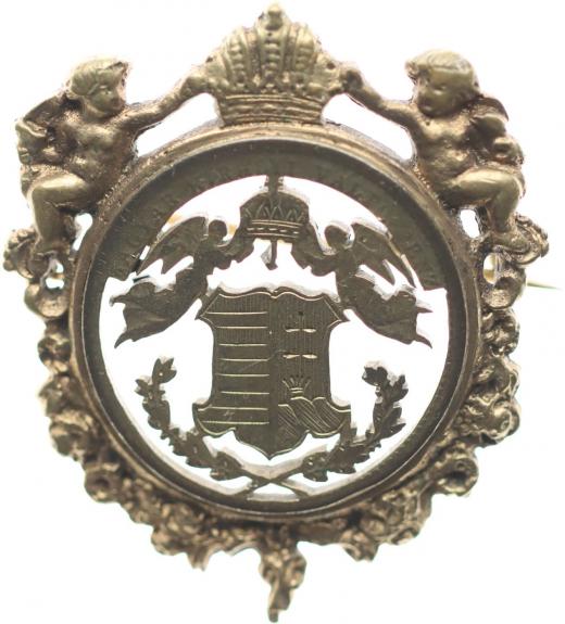 Nesign. - prořezávaný uherský znak v ozdobném rámečku se dvěma andlíky a korunou, Bronz 37,5 mm_připínací