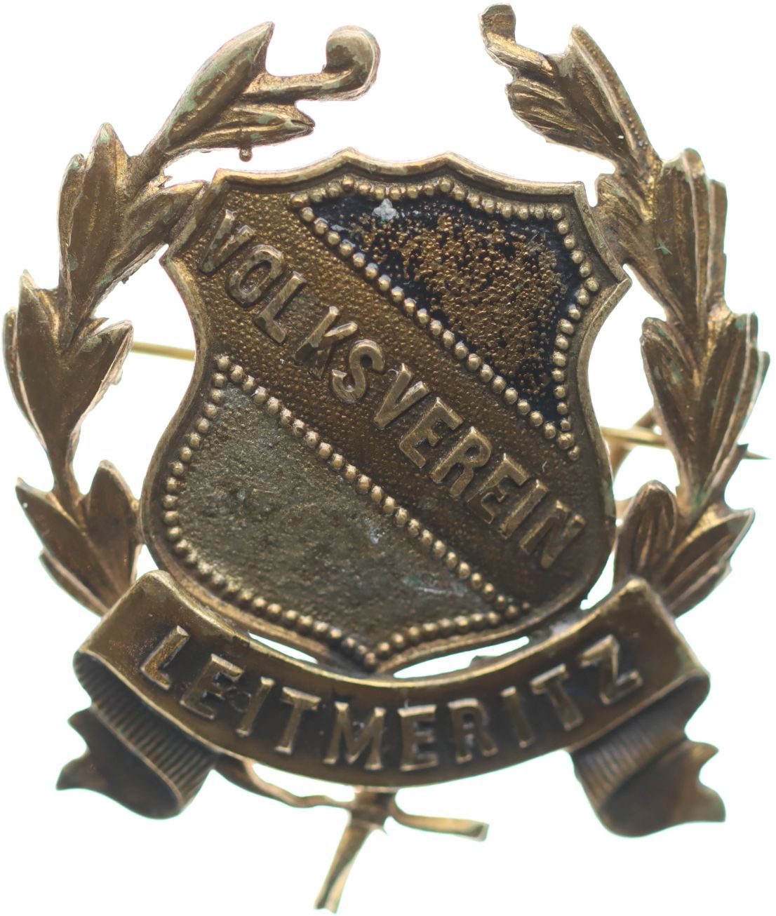 Litoměřice - VOLKSVEREIN LEITMERITZ, b.l. Štít s nápisem ve věnci, opis, Bronz 41x35 mm Sign.Emil Posselt jun. Gablonz a.N._připínací