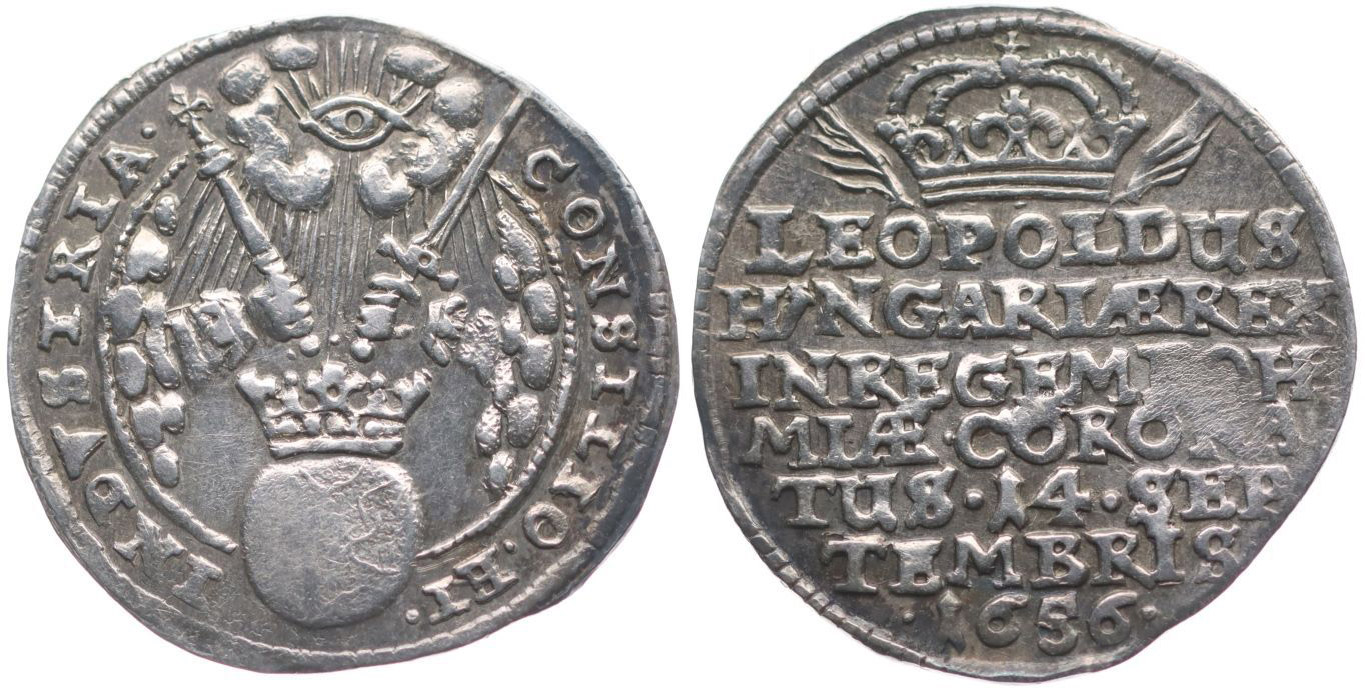 Střední žeton na korunovaci na českého krále v Praze 14.9.1656 7řádk.nápis pod korunou / pod božím okem drží dvě ruce žezlo a meč, Ag 21 mm, 2,08 g, Nov.IX/D-4b, Mo.866, Do.2458