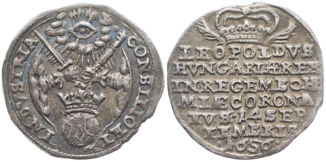 Malý žeton na korunovaci na českého krále v Praze 14.9.1656 7řádk.nápis pod korunou / pod božím okem drží dvě ruce žezlo a meč, Ag 17,5 mm, 1,50 g, Nov.IX/D-5b, Mo.-, Do.2459_R!