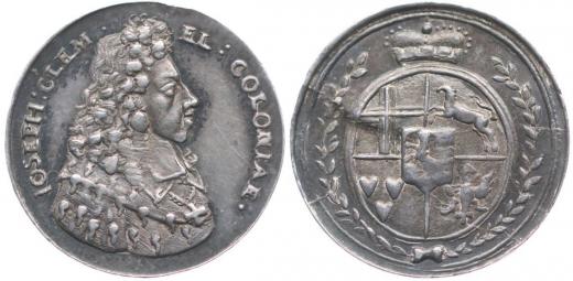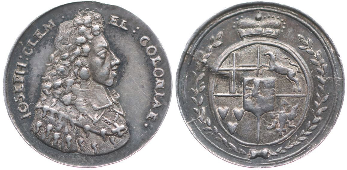 Medaile na římskou korunovaci v Augsburgu, b.l. (1690) Kolínský kurfiřt na koni zprava, opis / korunovaný znak mezi ratolestmi, Nesign., Ag 18 mm, 2.86 g, Nov.X/L-51a, Mo.-_R!