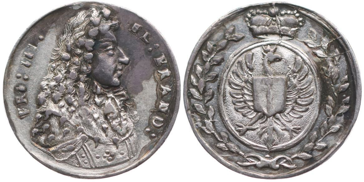 Medaile na římskou korunovaci v Augsburgu, b.l. (1690) Poprsí bavorského kurfiřta zprava, opis / korunovný znak mezi vavřínovými věncemi, opis, Nesign., Ag 18 mm, 2.26 g Nov.X/L-58a, Mo.-_skvrna v av. RR!