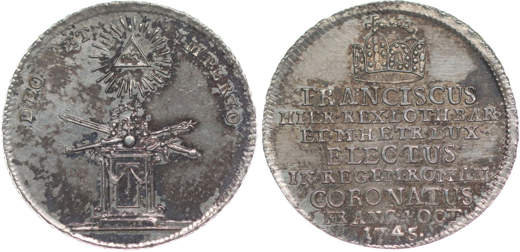 Větší jeton na korunovaci ve Frankfurtu, 1745#Ag Boží oko, korunov.klenoty na oltáři, opis / koruna, 8řádkový nápis, Ag 26 mm, 3.85 g, No.XIV/D-18b, Mo.1763
