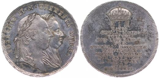 Větší jeton na návštěvu v Budapešti 25.6.1780 v souvislosti se školskou reformou v Uhrách, dvojportrét zprava, opis / 12řádk. nápis, Nesign., Ag 26 mm, 3.98 g, Mo.2096, LG.XIV/301, SD.285.2