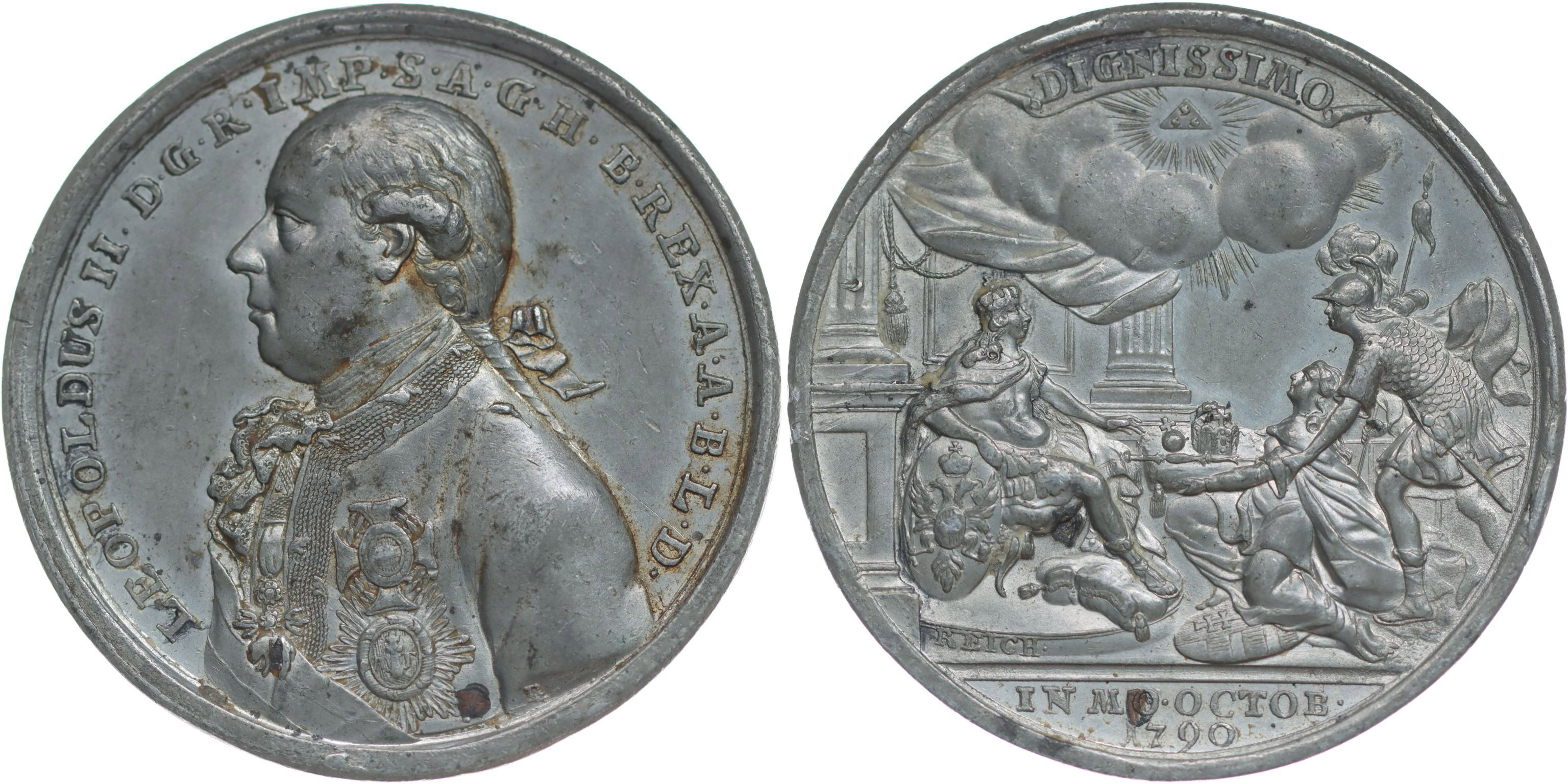 J.Ch.Reich - medaile ke korunovaci na římského císaře ve Frankfurtu#Sn 9.10.1790, poprsí císaře zleva, opis / sedící císař pod baldachýnem, proti klečící Germanie s vojákem, 2řádk.nápis v úseči, opis, v úseči, Cu stift, Sign., Sn 48 mm, 36.86 g, Nov.XVI/E-2c, Mo.2211, LG.XIV/1087_Cu stift R!