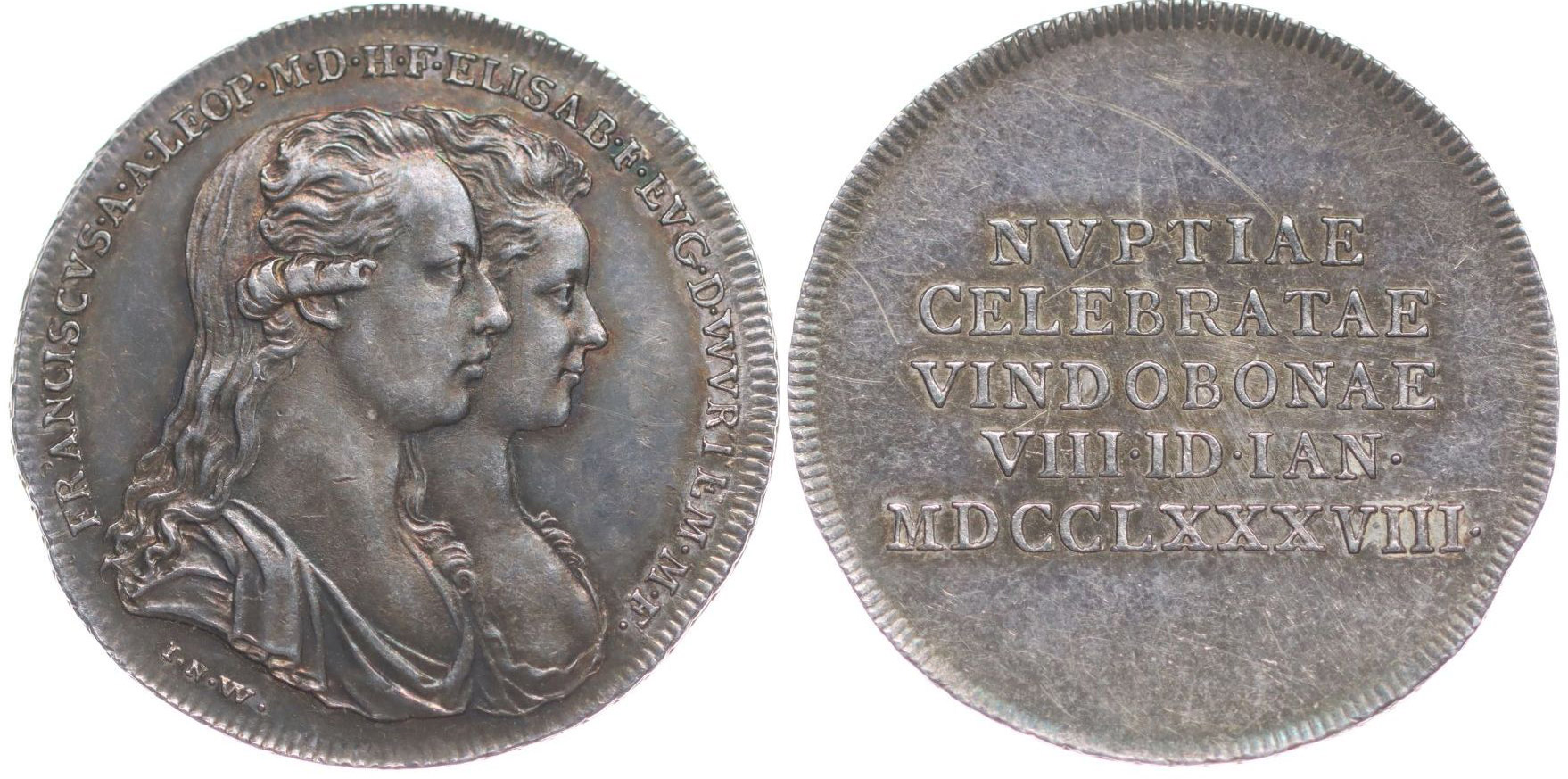 J.N.Wirth - Větší zásnubní jeton - Vídeň, 8.1.1788 Dvojportrét zprava, opis / 5-řádkový nápis, Sign., Ag 26 mm, 4.34 g, Mo.2178, Ho.3323, LG.XIV/1174, We.8321
