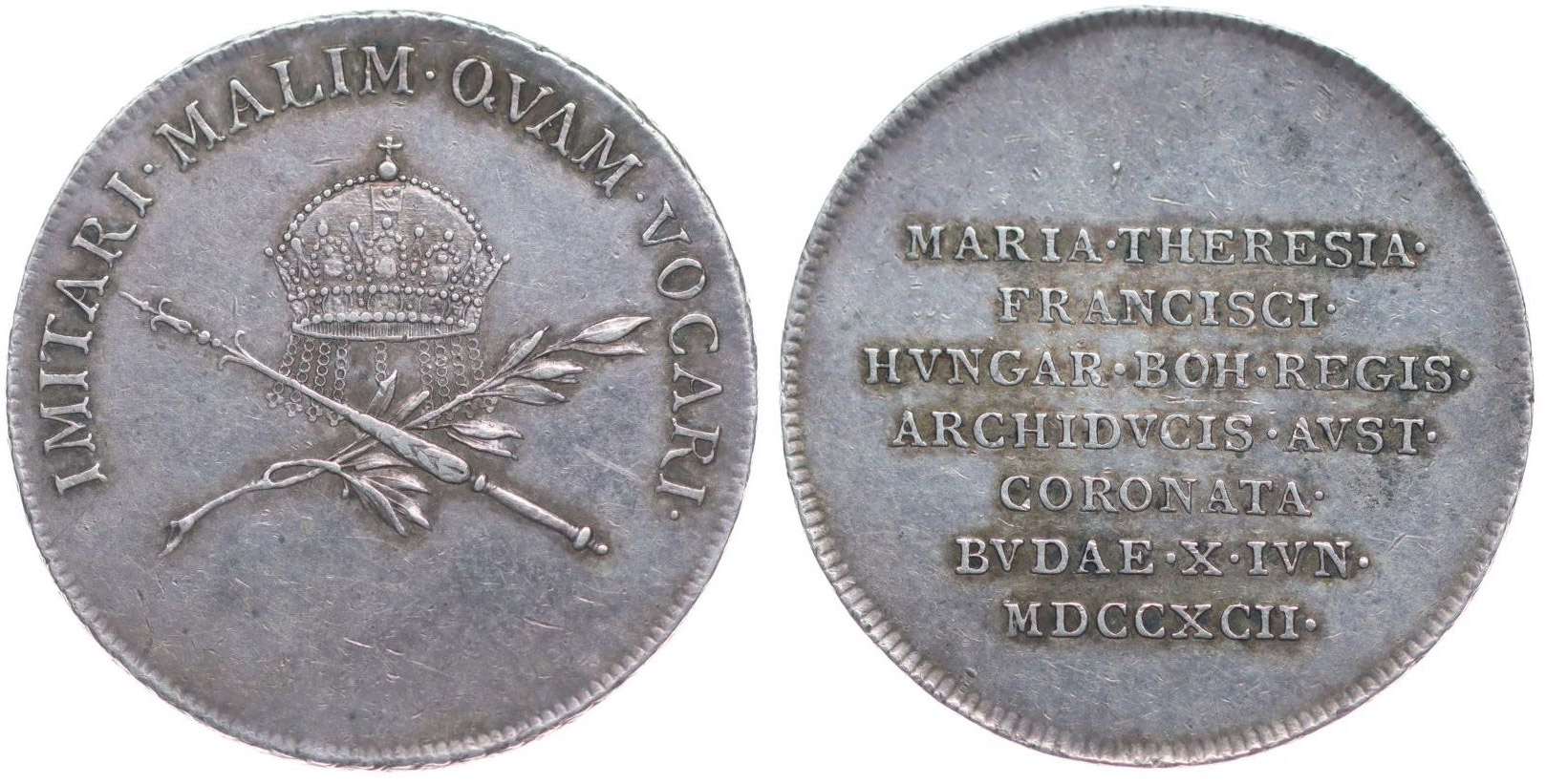 Větší peníz na korunovaci v Budě, 10.VI.1792 Koruna, žezlo a vavřínová snítka, opis / sedmiřádkový nápis, Nesign., Ag 25 mm, 4.1 g, Nov.XVII/S-2b, Mo.22643