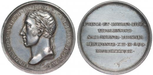 F.Putinati - medaile na holdování v Tyrolsku 1838#Ag Portrét zleva, opis / 5 řádk.nápis, Sign., Ag 34 mm, 21,01 g, Mo.2575, Nov.XVIII/F-1b, LG.XII/320, Ho.3632, We.8685 _dr.škrce v rev. R!