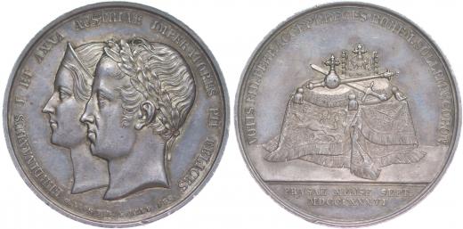 Loos a Held - medaile na korunovaci v Praze, 1836#Ag Dvojportrét zleva, opis / korunovační klenoty na stole, opis, Sign., Ag 39 mm, 19,34 g, ČS.1498, P.III/17, Nov.XVIII/1-Ib, Mo.2559
