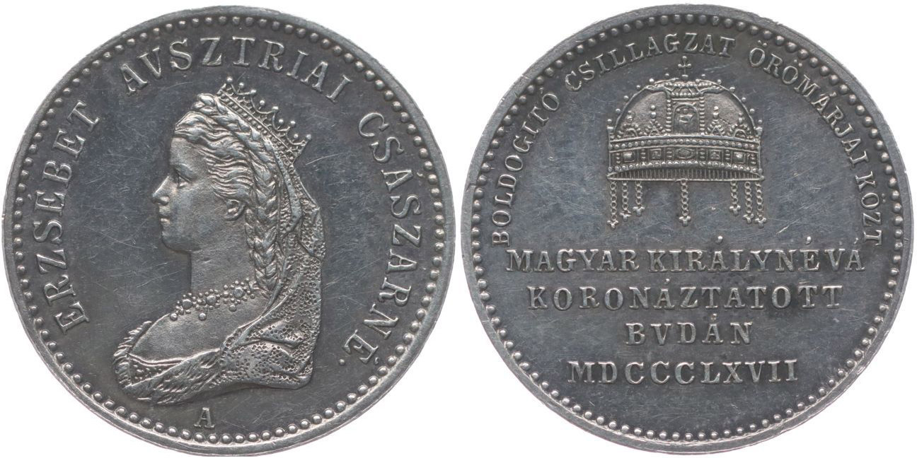 Menší maďarský peníz na korunovaci v Budíně, 1867 Korunované poprsí zleva, opis / koruna, písmo, Nesign. Nepunc., Ag 20 mm, 3.27 g, Nov.XIX/C-7b, Mo.2714, P.35
