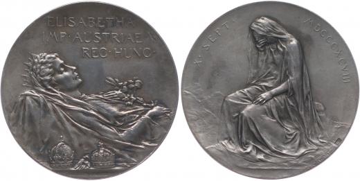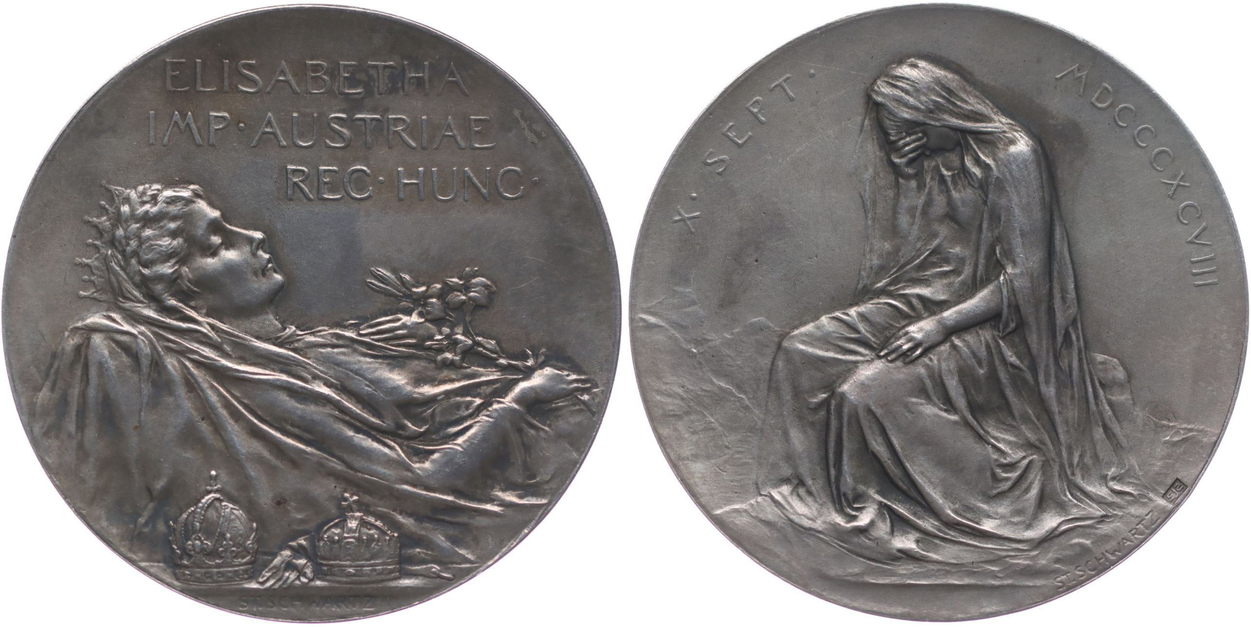 St.Schwartz - úmrní medaile, 10.IX.1898 Ležící císařovna, dvě koruny, nápis / truchlící postava, opis, Sign., Punc., Ag 40 mm, 20.7 g, Ho.3906