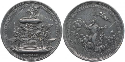 Svatý Jan Nepomucký - na paměť postavení stříbrného hrobu 1736 Stříbrný svatojánský náhrobek, nápis v úseči GABALVS, opis / sv.Jan Nepomucký s andělem na oblacích, Sign.Dockler, Sn 49 mm, Přib.566 _dr.škrce v av. a rev.