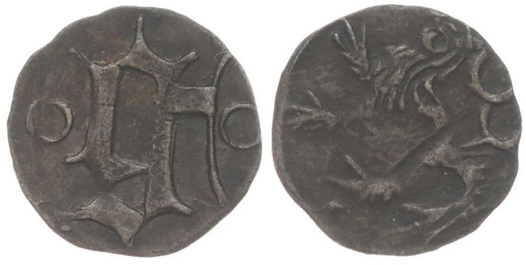 Haléř dvoustranný, minuskulní písm."g", po stranách po kroužku / korunov.dvouocasý lev, NŠ.1v, Kop.5947, SJ.2/2pod._R!