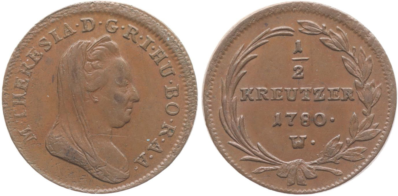 Cu 1/2 Krejcar 1780 W, Vídeň, Nový.61b, Novot.13, Her.1633