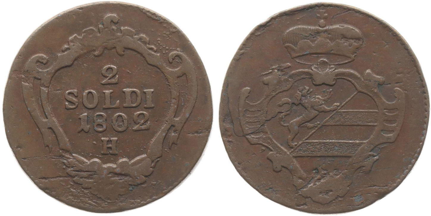 Cu 2 Soldi 1802 H, Günzburg pro Gorici a Gradišku, Her.1168 _dr.v.stř. v av. a rev.