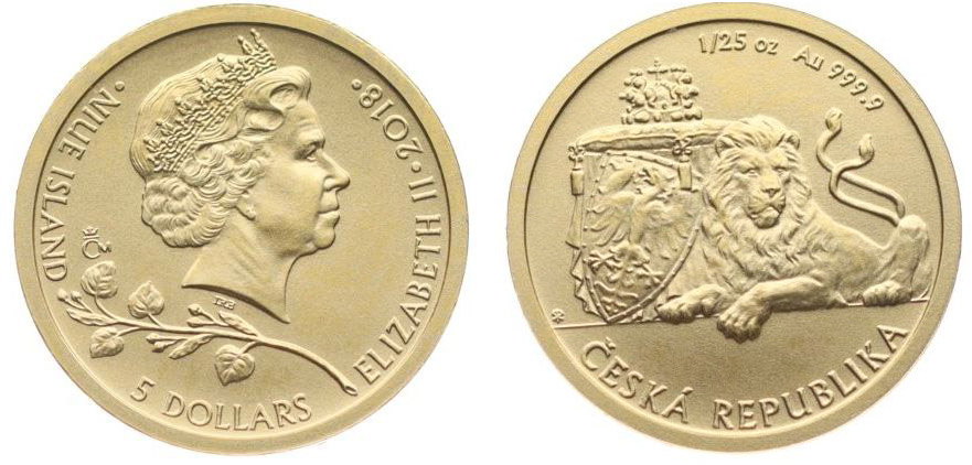 5 Dolar (1/25 Unce) 2018 Portrét královny Alžběty zprava, opis / český lev, opis Česká republika, ryz.999/1000, Au 13 mm, 1,245 g