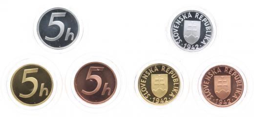5 Hal.1942 - Punc.986 Au 14 mm, 1,71 g, Punc.999,9 Ag 14 mm, 1,75 g Cu 14 mm, 1,60 g, novoražba - náklad 50 ks _celk.3 ks v orig.etui s potiskem SR 1942 + kapsle + certif.