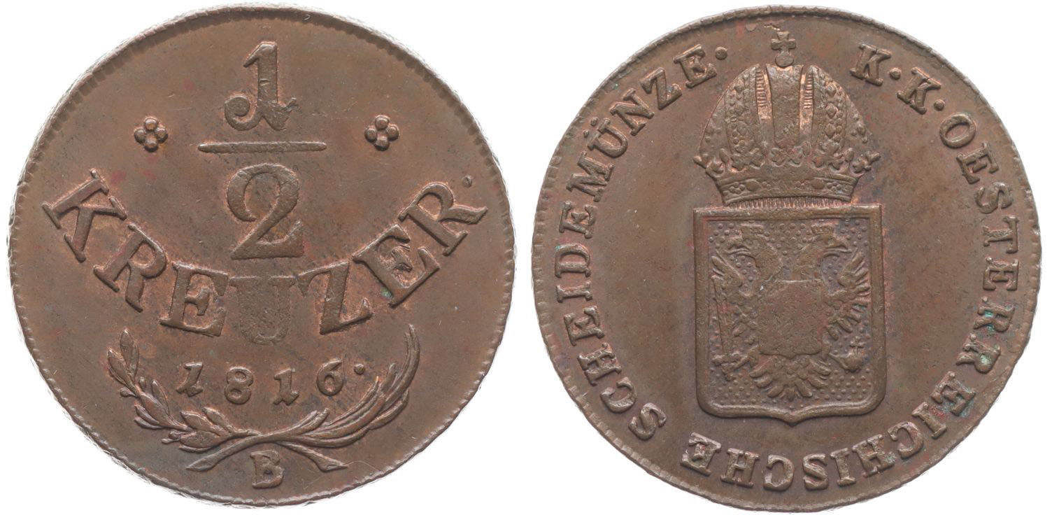Cu 1/2 Krejcar 1816 B, mincovna Kremnice