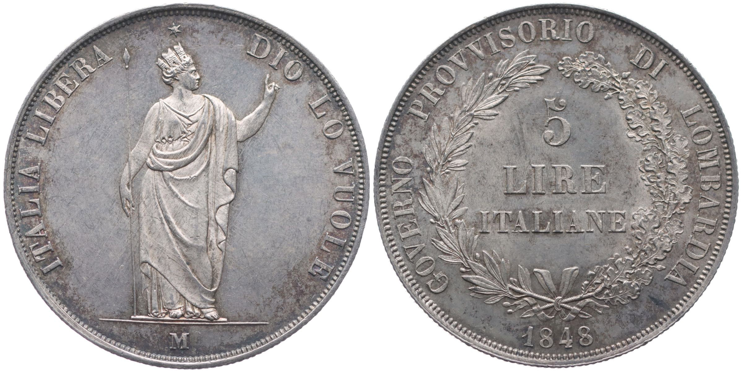 5 Lira 1848 M - dlouhá stuha, Cr.22, AM.1b, Her.3, Ves.12b