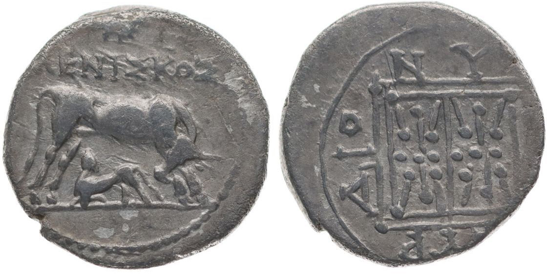 AR drachma, Kráva s teletem zprava, hlava Isis, nápis "MENISKOS" čtvercový ornament,opis, pod.jako SG.1900
