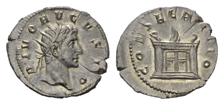 Divus Augustus. Antoninianus circa 250-251, AR 24mm., 3.35g. Radiate head right. Rev. CONSECRATIO Lighted altar. C 578. RIC Trajan Decius 78.Extremely fine.