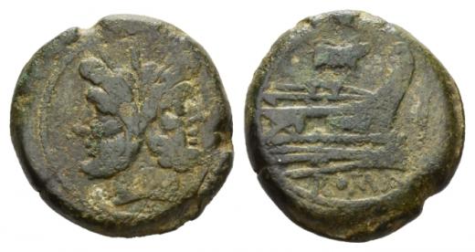 Sow series. As circa 206-195, Æ 34mm., 40.05g. Laureate head of Janus; above, mark of value. Rev. Prow right; above, sow. Before, mark of value and below, ROMA. Sydenham 254. Crawford 121/3.Scarce. Green patina and about very fine. Ex I. Vecchi sale 3, 1996, 255.