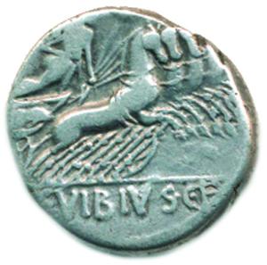 Denár, velká hlava Apolla zprava, za ní PANSA / Minerva na quadri ze C. VIBIVS. C. F Seaby 1