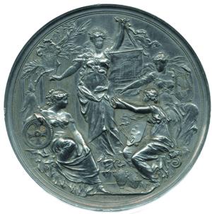 Rudolfinum - 50 let České spořitelny 1825-1875 (něm. opis) / aleg orie, bez textu Ag 65 mm 100,45 g "RR" krásná star á patina