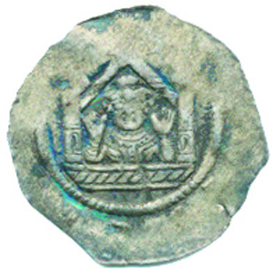 Denár C - 593 ac - značka "E" v poli chybí, kulička mezi sedící mi postavami_opis ned.