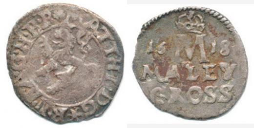 Malý groš 1618, K.Hora-Hölzl HN 3a/opis 3a var.: MALEY CROSS